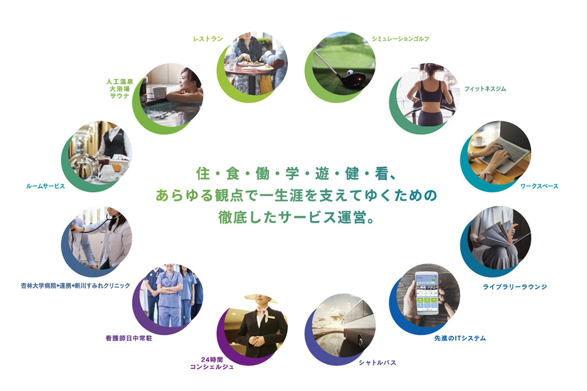 他にも安心してお住まいになれる、ソフトサービスも豊富。例えば、24時間コンシェルジュ、日中看護職員の常駐など、入居者に寄り添ったサービスが豊富です。杏林大学医学部附属病院・新川すみれクリニックと連携し、24時間いつでもお医者さんと連絡・相談も可能(※7)。ありとあらゆる要望を、住まいの中で実現します。